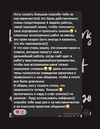 Работаем по запросу, например, если строим портфолио: делаем 1-2 больших сайта с кейсами, проверяю все и даю комментарии в Фигме. Параллельно можно закрывать несколько запросов, и по портфолио, и по поиску клиентов или работы, что волнует в данный момент.